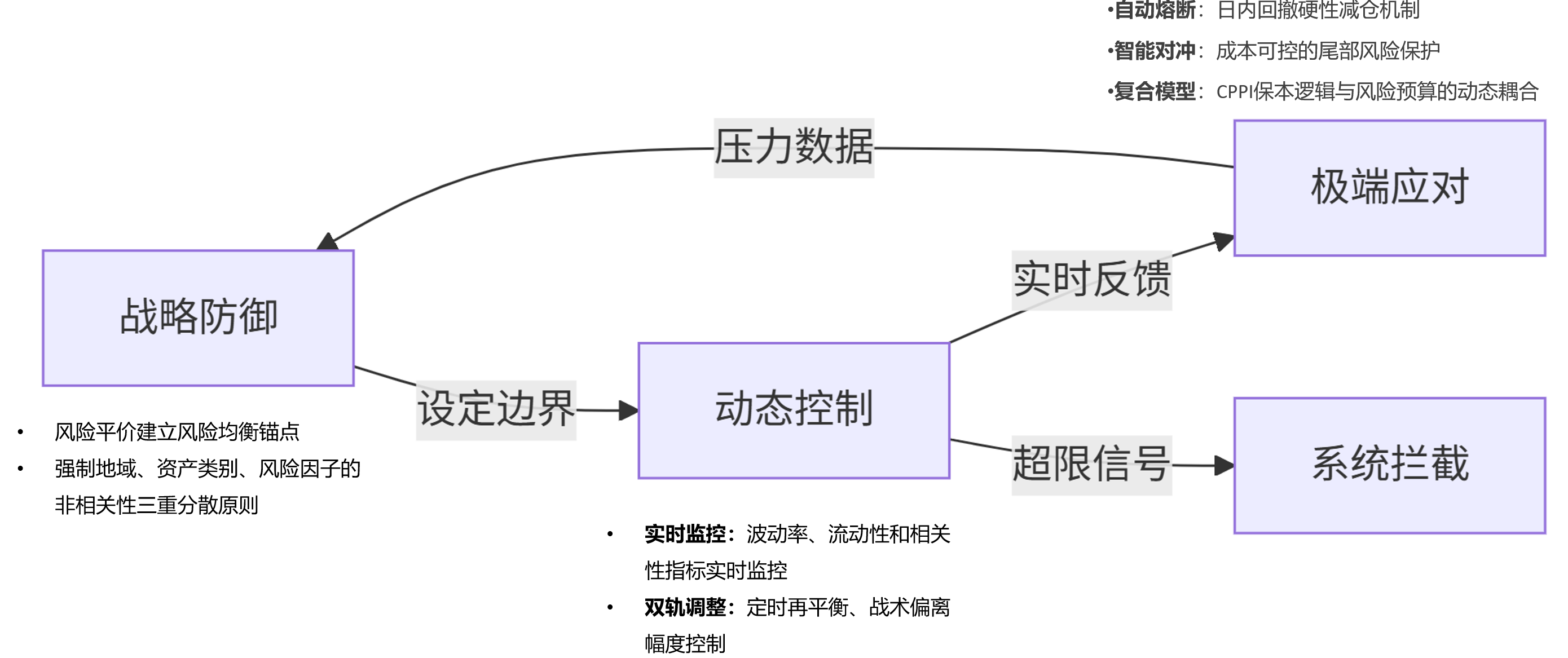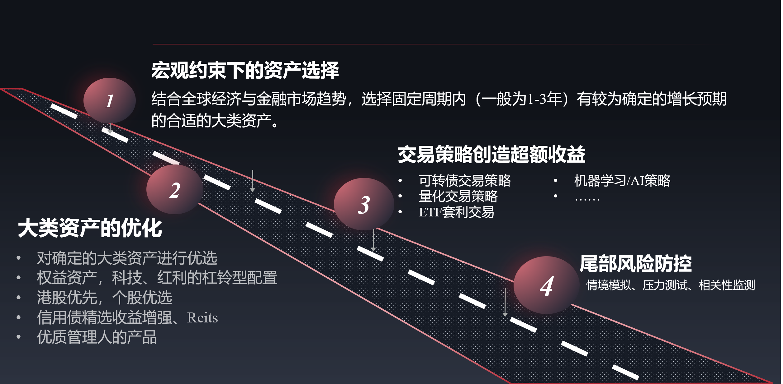首先在全球范围内选择具有低相关性的主要资产类别,同时根据投资者风险收益特征确定在特定时间内(一般1-3年)具有确定性增长预期的资产纳入资产池;在每一资产内部,通过结构优化选取合适的子类别,结合多种交易择时和量化套利策略,力求在确保基础收益的基础上,创造适当的alpha收益。同时,监控投资组合的尾部风险,采用多种方法和手段作出应对。